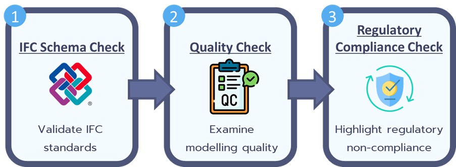 Quality Check: This check ensures BIM models across all disciplines meet the minimum quality standards specified in the CORENET X Code of Practice for effective regulatory review. It identifies issues such as:
